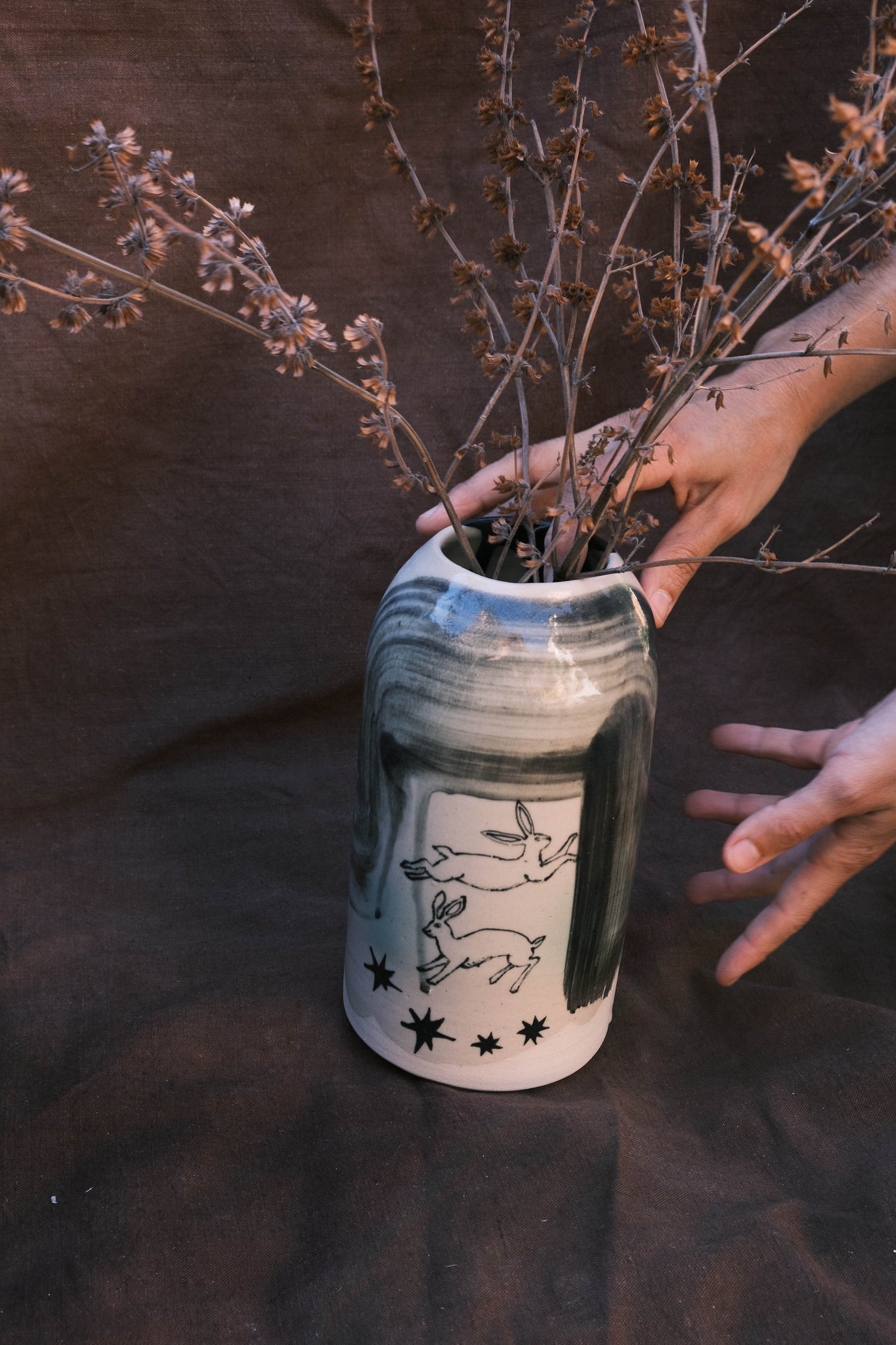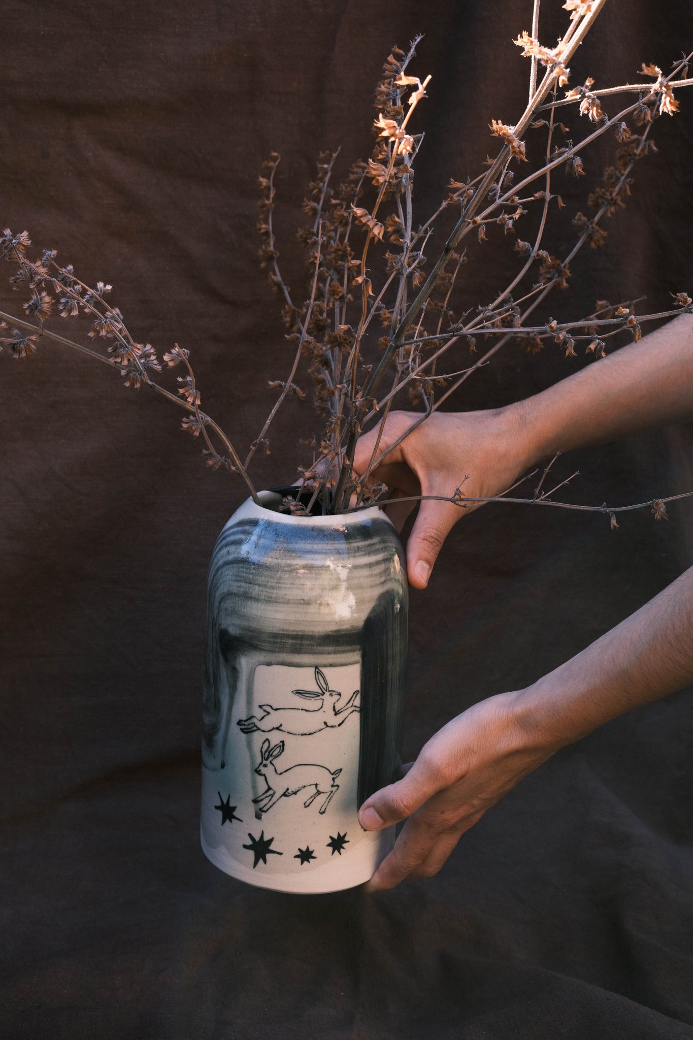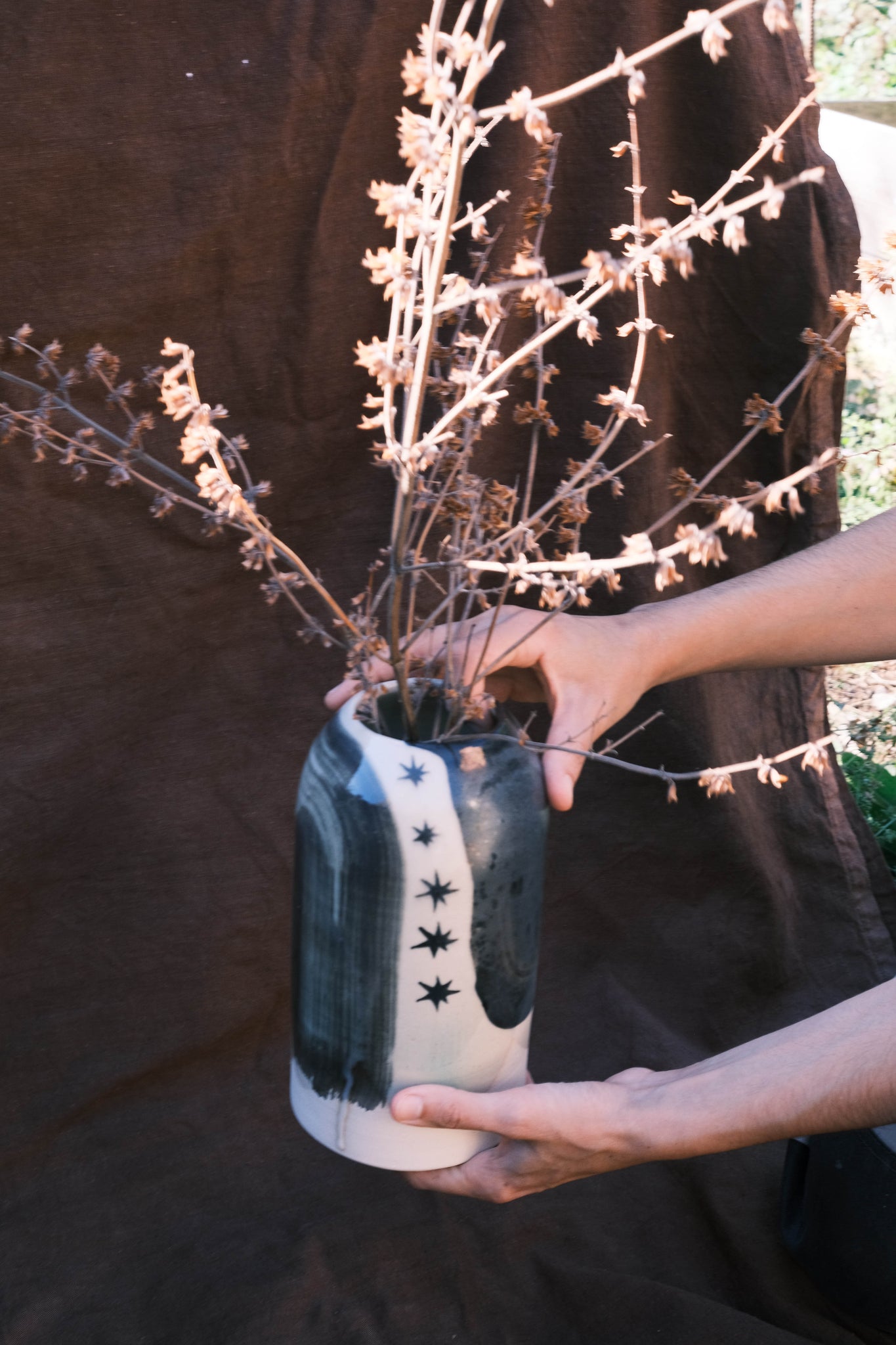 - Façonné et décoré de A à Z à la main en grès blanc décoré à l'engobe noire